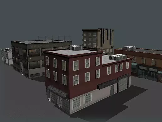 Each of the buildings polygon counts range from about 500 triangles --> 1,000 triangles.