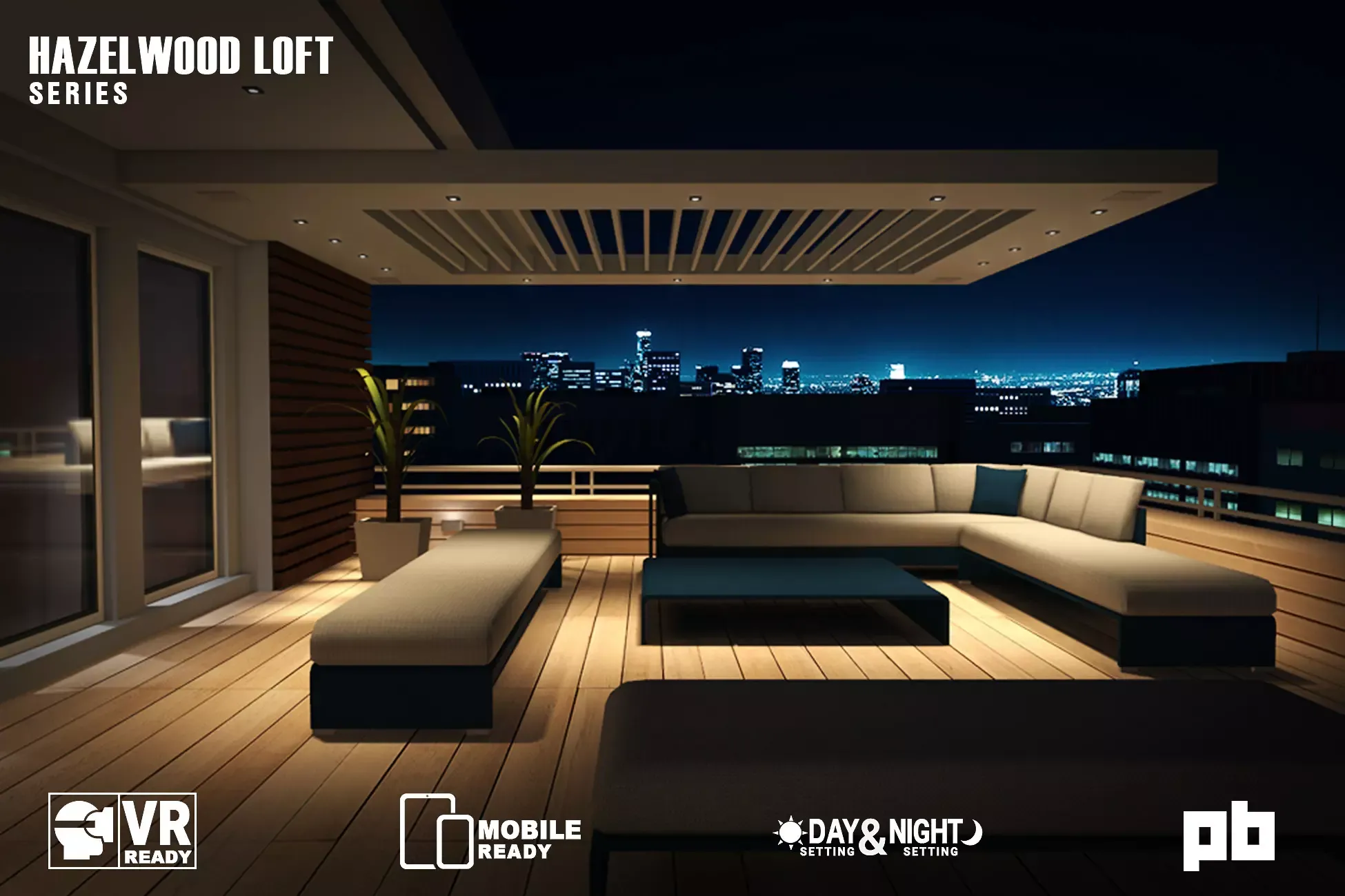 •part of the “Hazelwoodloft” series. •a photo-real & modern terrace. •a set of terrace furniture & items. •4K skyboxes: clear day, cloudy day, sunset, midnight, dawn. •days & nights skyboxes match perfectly, window for window. • original 8K Photoshop source file with layers included. •ready for Oculus, GearVR, Vive, Daydream. •ready for low & high-end mobile devices. •inspired by modern architecture & design. •remarkable attention to lighting & detail. •two different settings, day & night time.