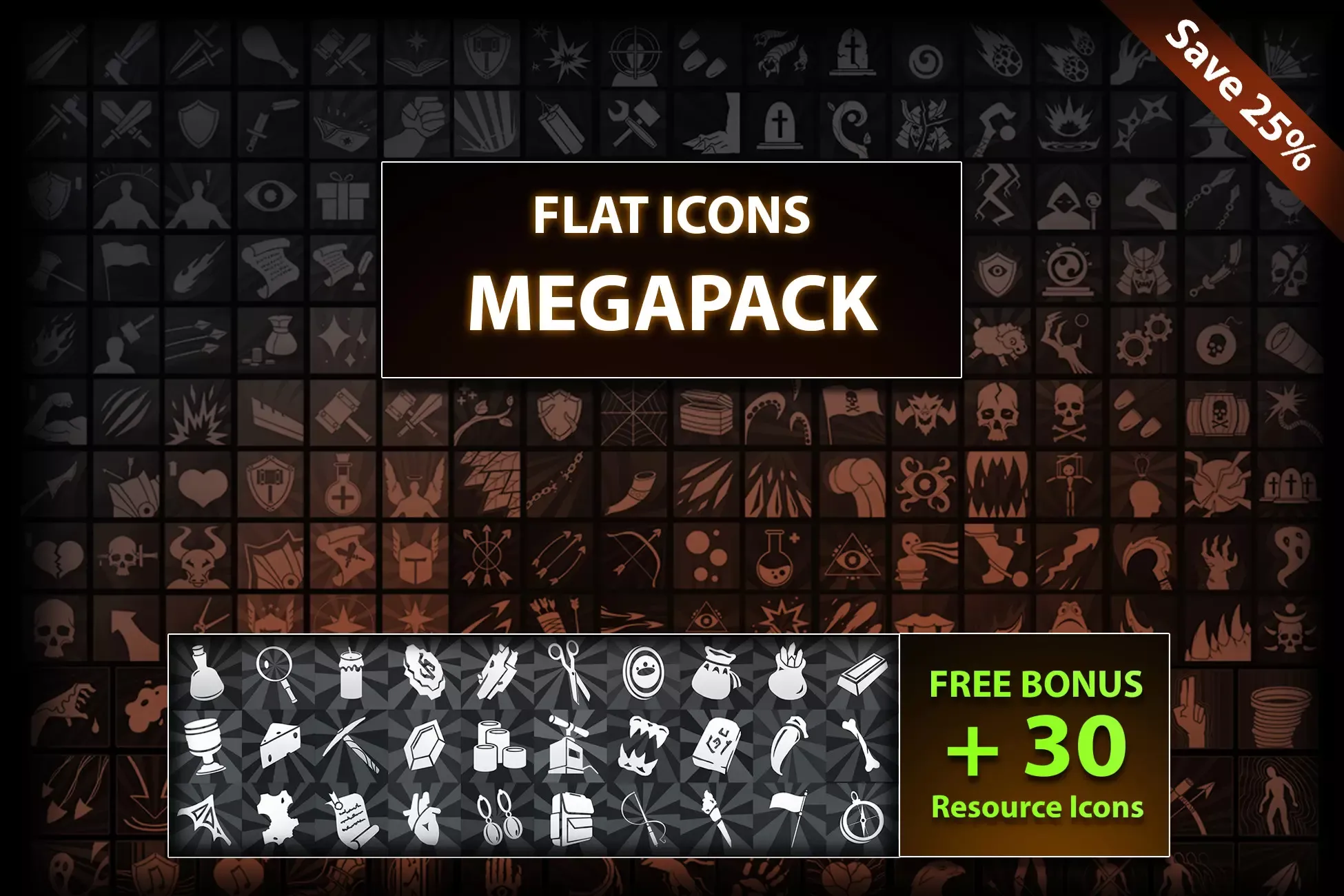 Set of 735 high-quality flat icons in fantasy style. All icons have transparent background 256x256 pix PNG. Source files (1024x1024 pix PSD (layered) for all icons). Perfect choice for RPG, Card and MOBA games.