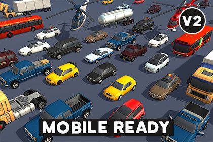 All models share the same material and texture, a 4096*4096 atlas, for optimum performance on mobile devices. The polygon count for each model is around the 1k mark and each vehicle has separated wheel meshes. All the models have a custom mesh collider.