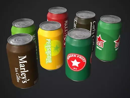 Seven different beverage can labels with fictional non-existing brands. All brand names and trademarks are my own creation and not real world products, brands or companies.