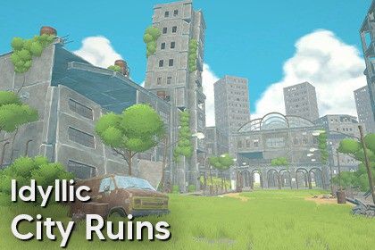 An abandoned, post-apocalyptic city environment with a peaceful and idyllic atmosphere
