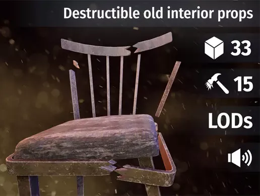 Destructible old interior props pack with VFX, SFX and LODS for you game! VR Ready!
