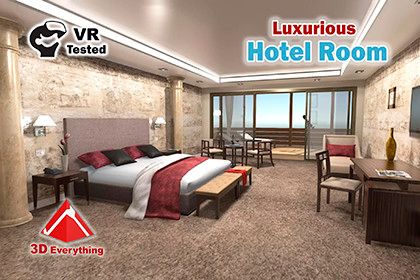 Luxurious hotel room which includes a big balcony. There are 45 models of furniture and objects similar to the ones we could find in a real room of this characteristics. There is a bed, three different types of semi-classical chairs, lamps and two kinds of tables. Other objects in the room are pictures, vases, a telephone, glasses,a bottle of wine, a telescope and other models which give the scenary a higher sense of realism. All the models are low-poly to be used in games and applications. Our latest update has been tested for VR