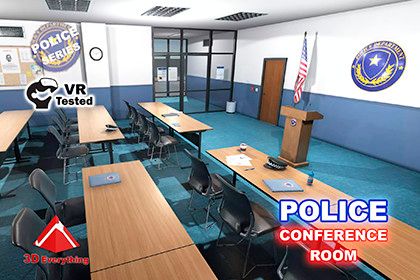 Interior of a conference room of a police station that can also be used as a press conference room. There is furniture like chairs, desks and a lectern. There are also other objects like flags, notebooks, folders, informative papers, posters, a water dispenser, a police hat... etc. All the models are low-poly to be used in games and applications. Our latest update has been tested for VR