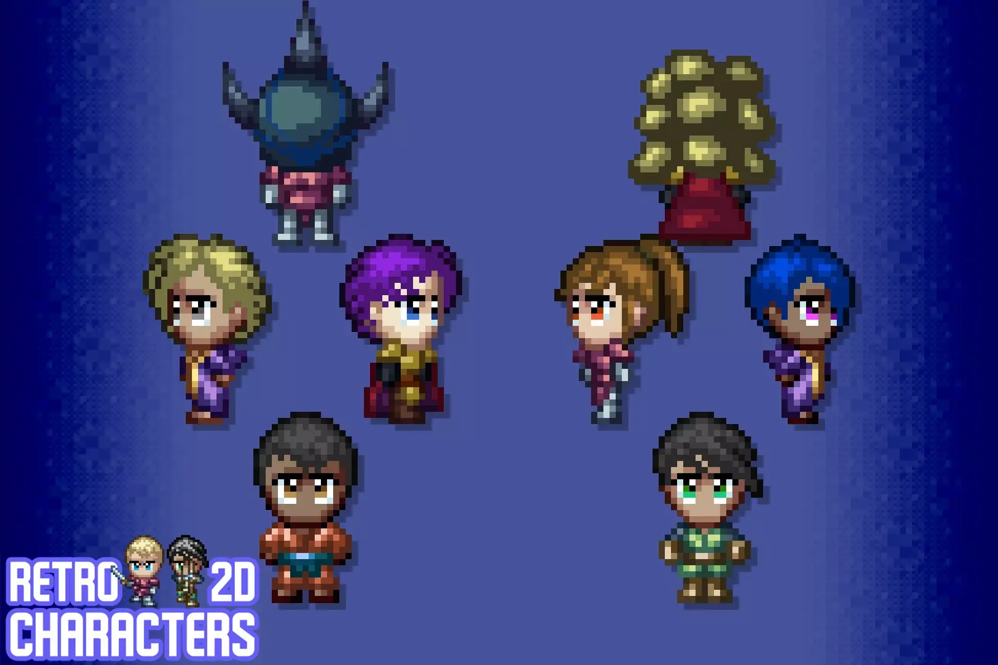 Retro 2D Characters features male and female pixel art characters with variations in outline style, outfit, hairstyle, eye color and skin tone. These characters are inspired by classic, 16-bit era RPGs/JRPGs. They feature 23 total animations, from walking to jumping, nodding, sword swinging, taking damage, carrying (oversized vegetables?) and more!