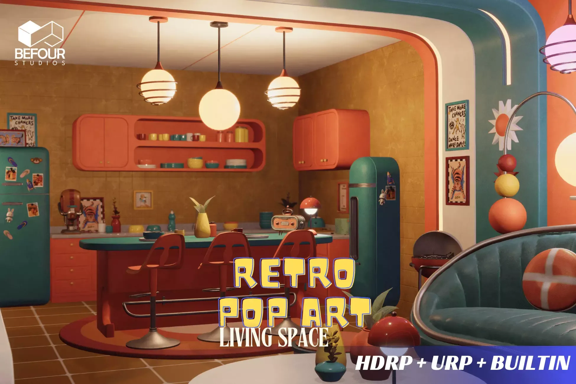 The assets include retro furniture, colorful props, decorative wall art, and vibrant lighting. Lamps feature adjustable emissive materials, letting you easily change colors to set the perfect mood. All materials use ORM workflows for high-quality visuals with great performance.