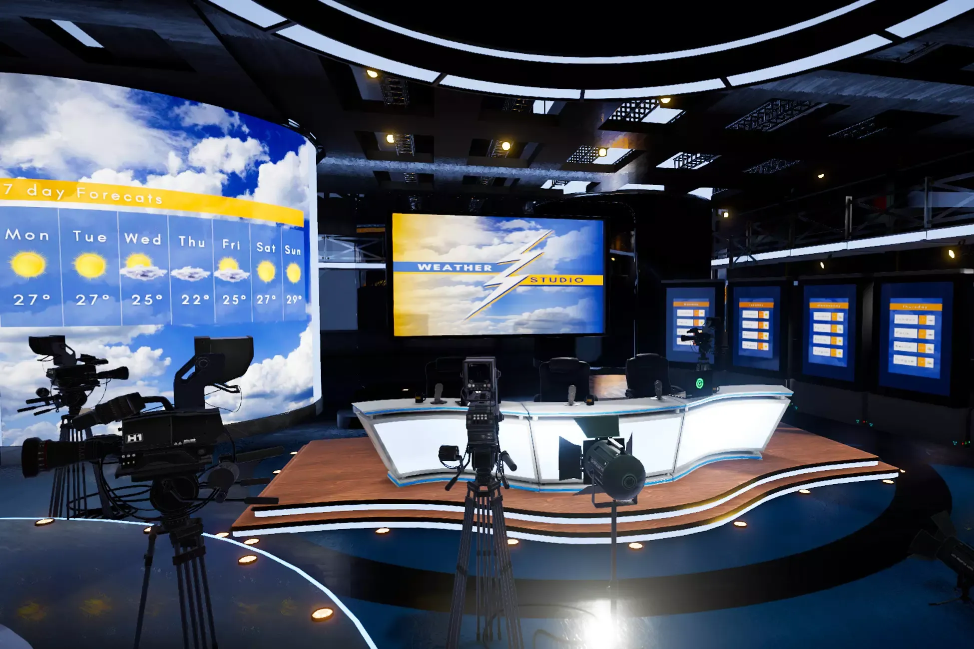 Weather TV Studio 2. is a modular TV studio with 3 set-ups and 49 studio props.