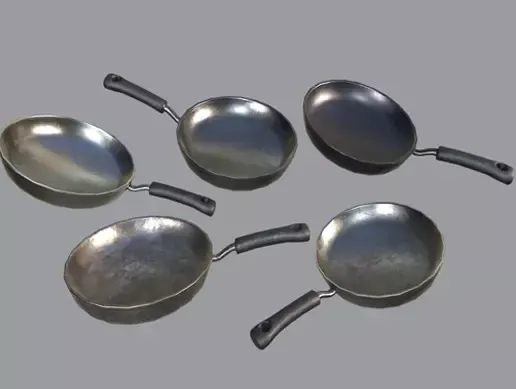 Very Detailed Kitchen Frying Pan with 5 Different Material Variations with Realistic High-Quality PBR Texturing, such as an Old / Rusty / Scratched / Clean Textures.