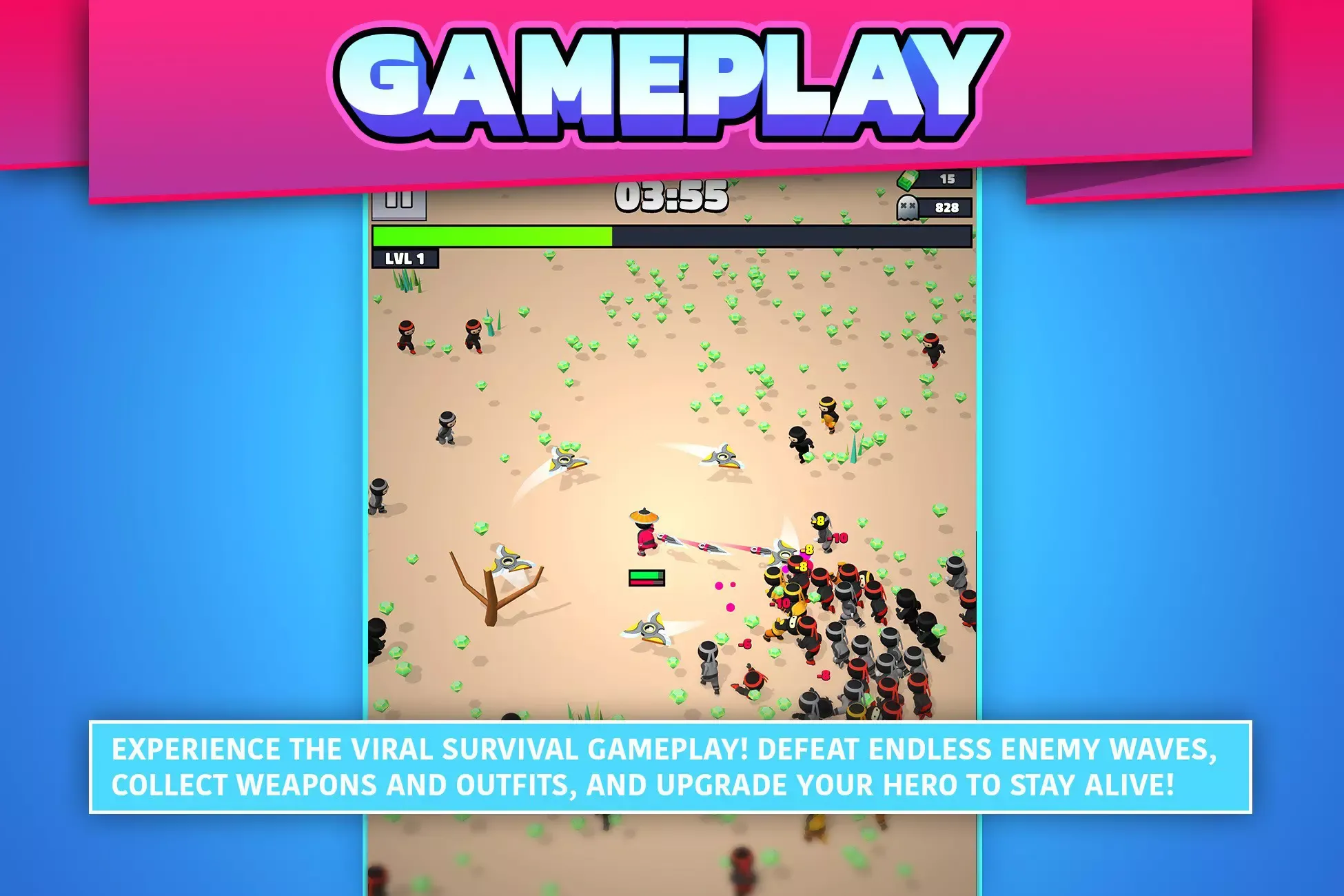Survive thrilling waves of enemies in intense auto-attack combat. Players move freely while their hero auto-fires at enemies, collecting loot and avoiding danger to survive longer and deal massive damage.
