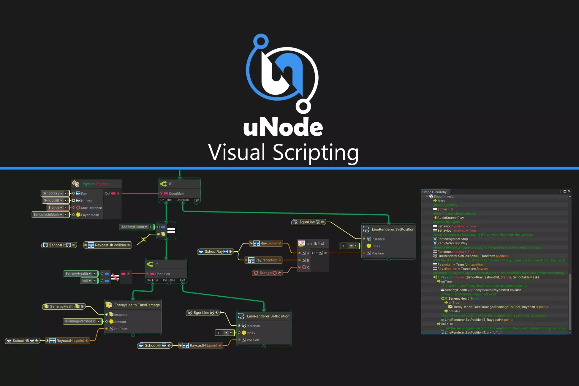 uNode is Visual Scripting plugin for Unity 3D. This plugin allows designers, artists and programmers to create gameplay mechanics, interactive systems and even C# script without writing a single line of code.